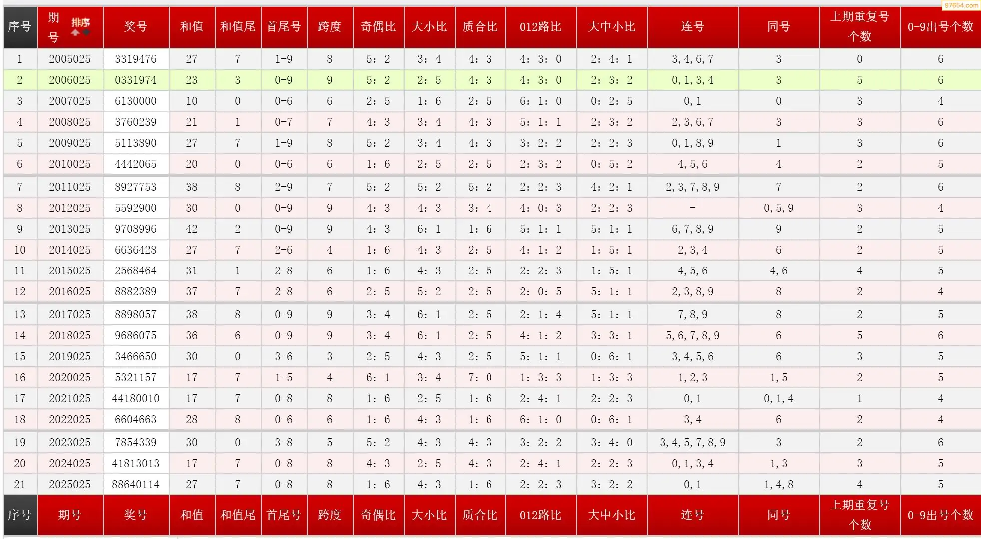 025期七星彩历史同期图表+走势图