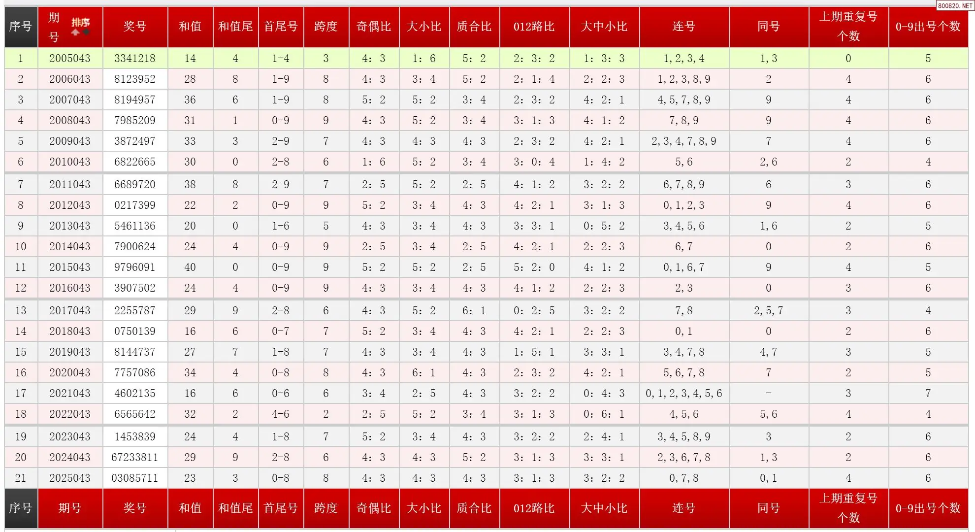 043期七星彩历史同期图表+走势图