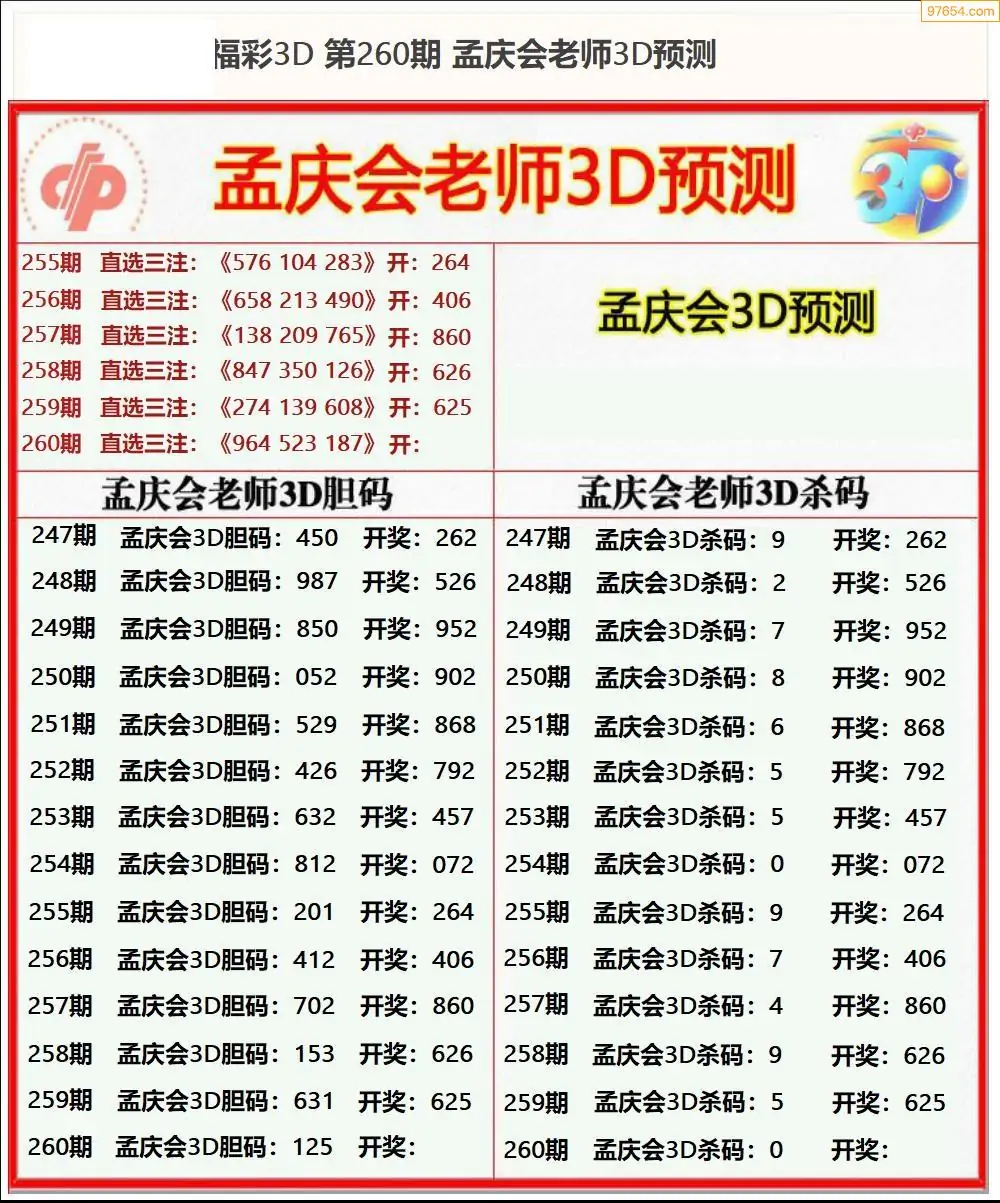 25年260期今晚孟庆会推3D胆码