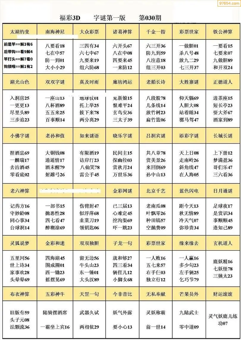 030期3D牛彩预测报+彩吧字谜报