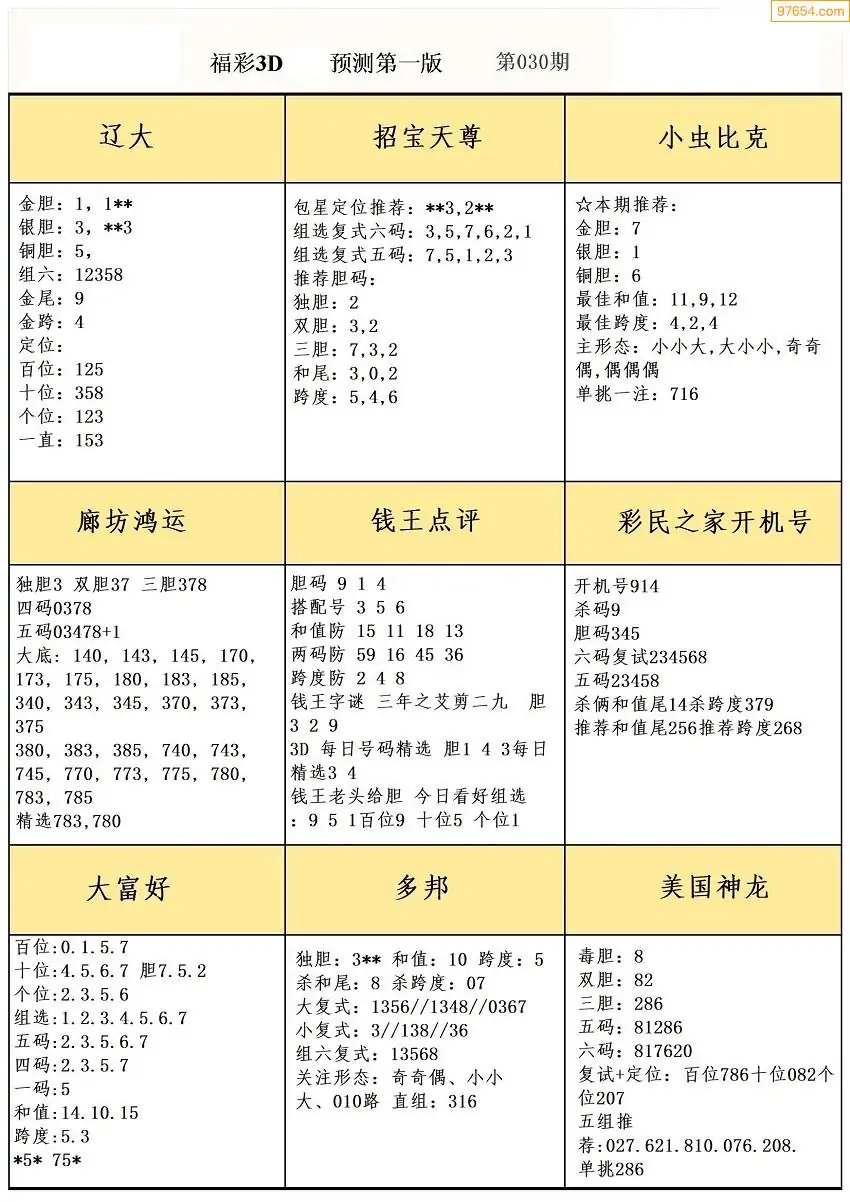 030期3D牛彩预测报+彩吧字谜报
