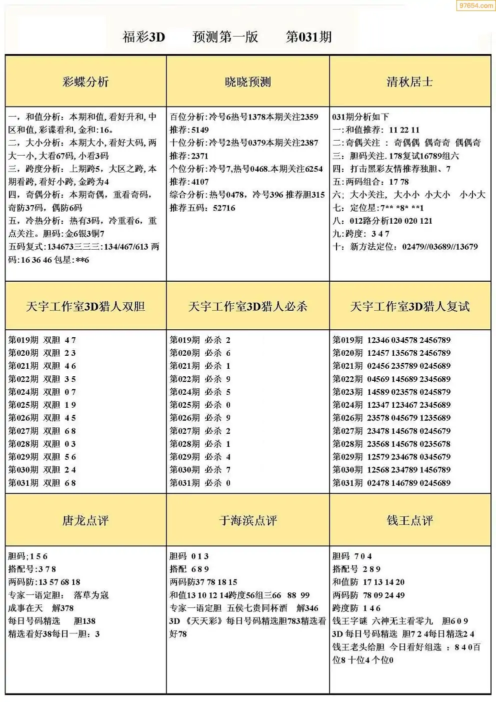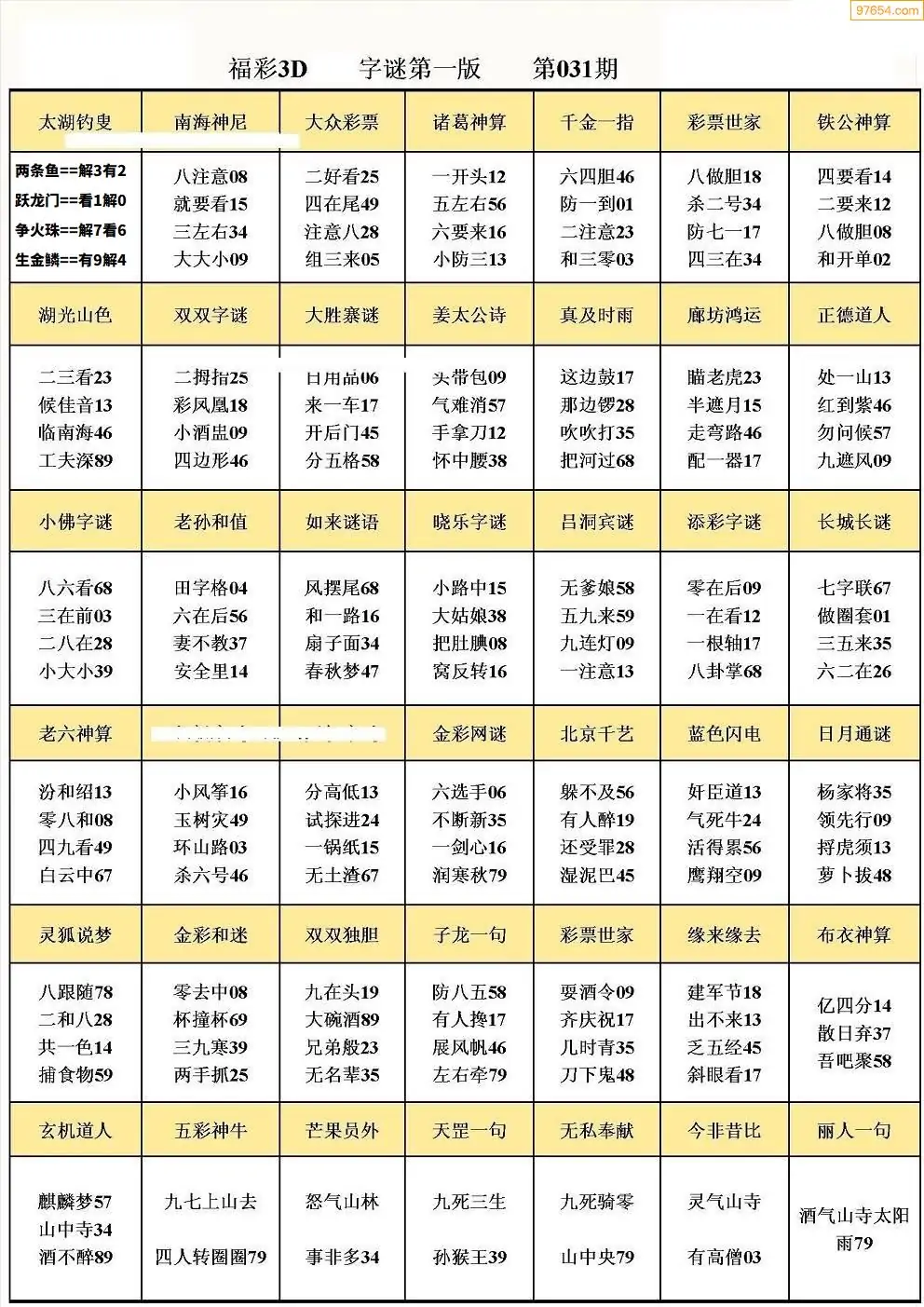 031期3D牛彩预测报+彩吧字谜报