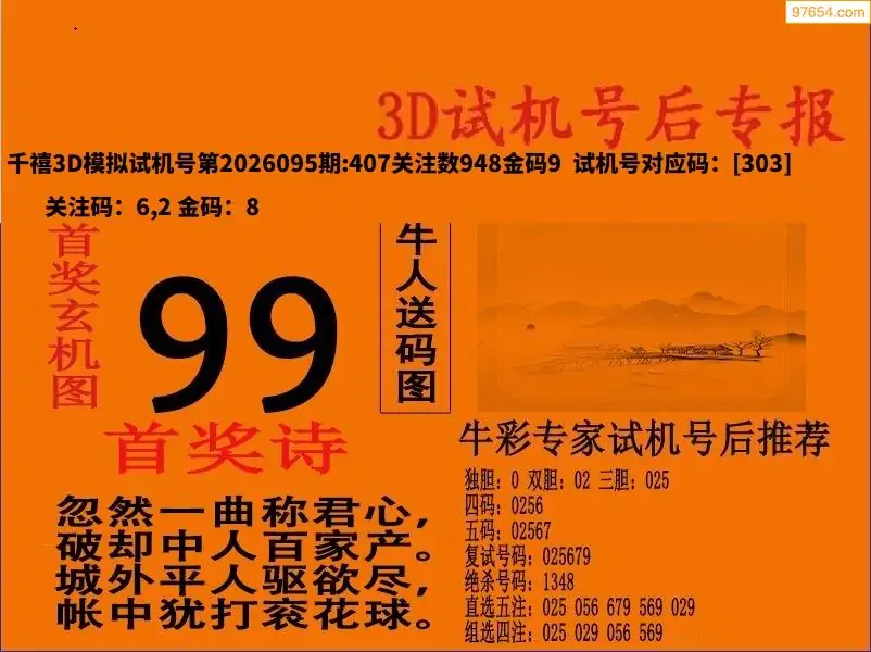 26095期福彩3D试机号后首奖诗