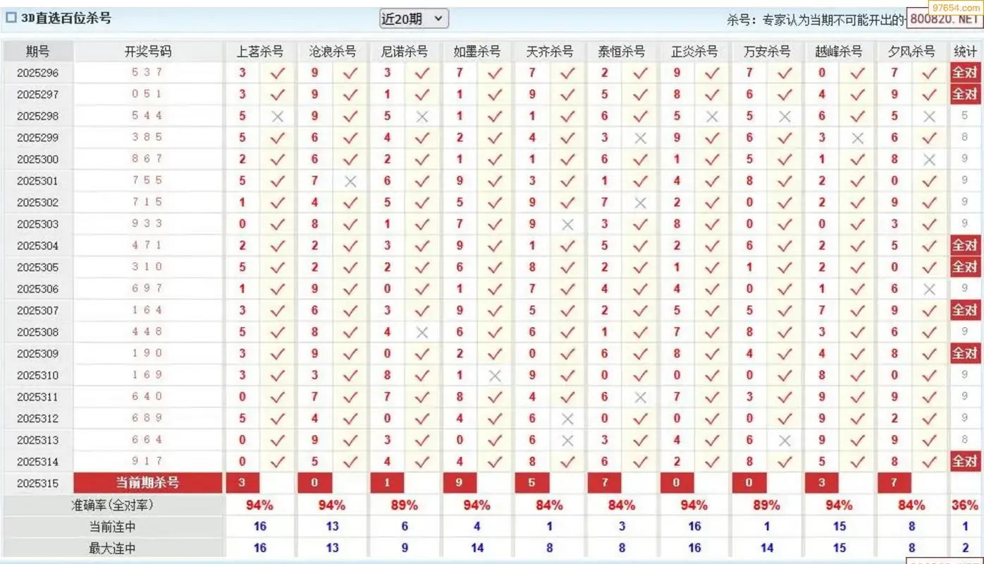 师姐25年315期3D准杀号 10连中