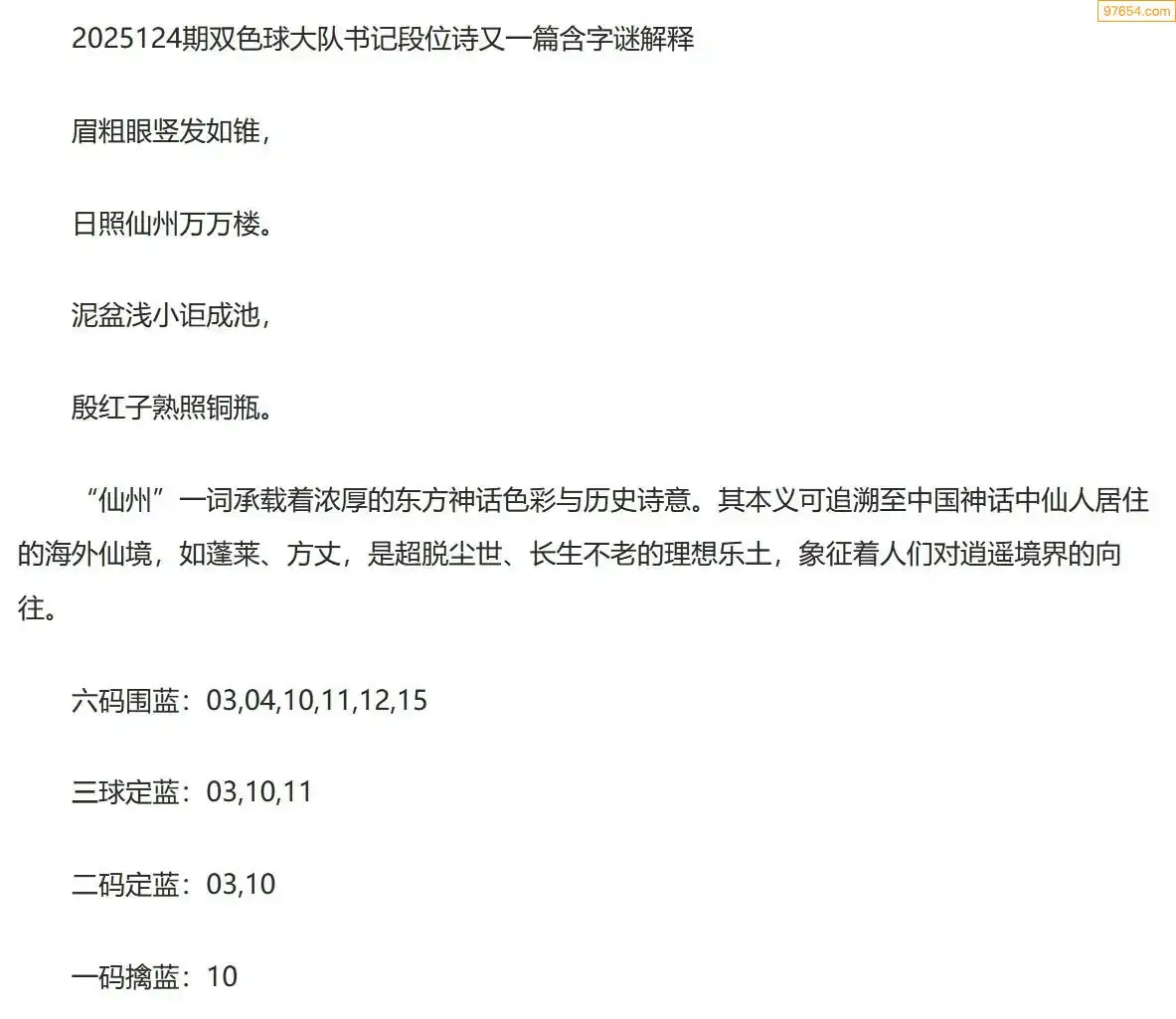 大队书记双色球25年124期段位诗谜