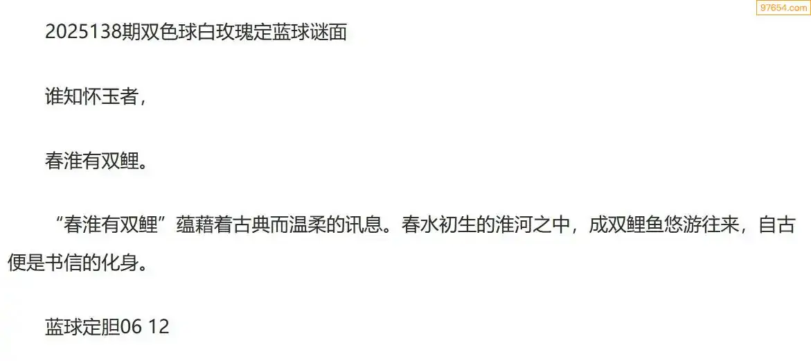 白玫瑰双色球25年138期定蓝球字谜