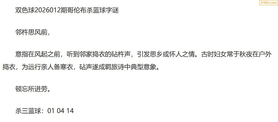 哥伦布双色球26年012期一句杀蓝球字迷