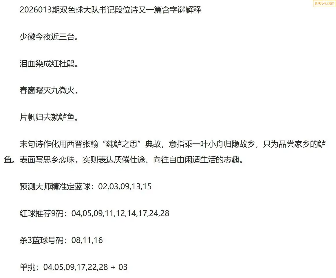 大队书记双色球26年013期段位诗谜