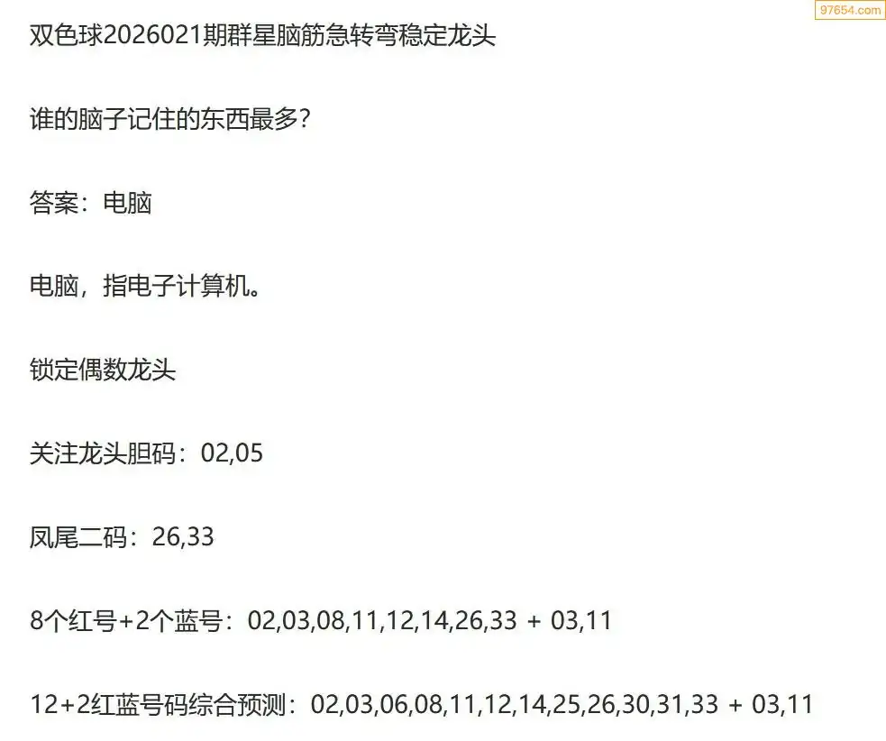 群星双色球26年021期脑筋急转弯龙头谜语