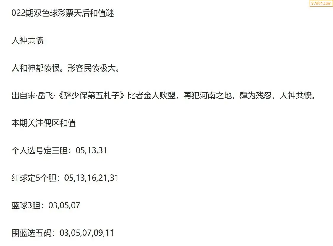 彩票天后双色球26年022期今日和值谜