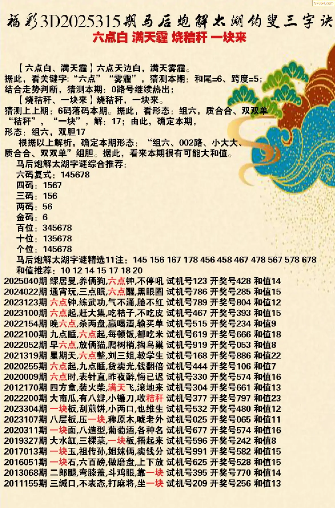 25年315期马后炮解3d太湖钓叟之 六点白